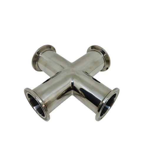 Nerūdijančio plieno SS304 kryžminė jungtis su Tri Clamp jungtimi. 1.5" dydžio. Leidžia sujungti keturis vamzdynus sanitarinėse sistemose. Naudojama maisto. gėrimų. farmacijos ir kituose higieniniuose procesuose.